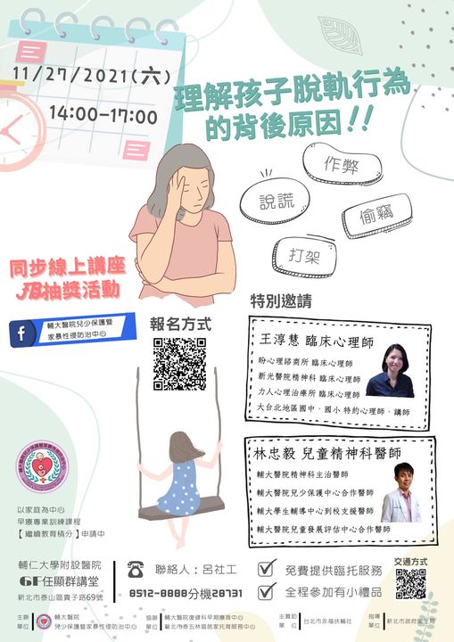 邀請到王淳慧心理師(教養篇)及林忠毅兒童精神科醫師(醫療篇)蒞臨現場講解出現在孩子身上的脫軌行為![]()
