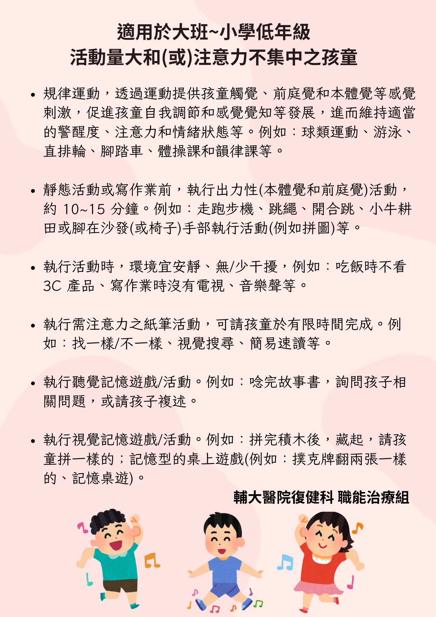 居家活動建議-適用於大班~小學低年級活動量大和(或)注意力不集中之孩童 Post author:a00107 Post published:2025 年 10 月 1 日 Post category:注意力不集中 / 衛教資源 You Might Also Like 兒童語言互動技巧 2025 年 8 月 7 日 居家活動建議 2025 年 4 月 1 日 【 2-3歲 】促進兒童語言發展策略 2025 年 6 月 17 日