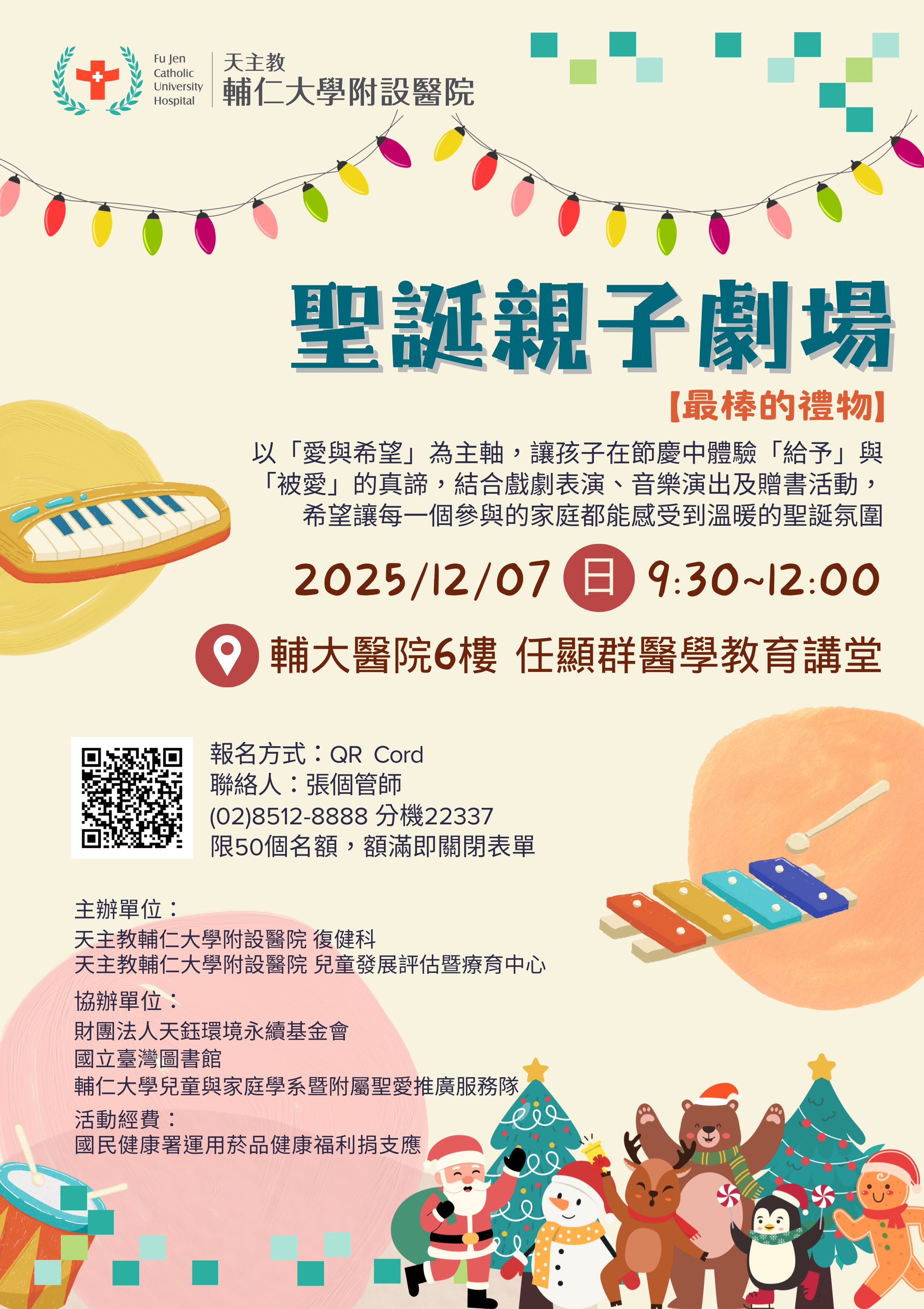 2025聖誕戲劇活動 Post author:a00107 Post published:2025 年 11 月 28 日 Post category:活動剪輯 / 聖誕活動 聖誕節是一個充滿愛與分享的季節,為了讓親子家庭在節慶中體驗「給予」與「被愛」的真諦,輔大醫院早療中心將在12月7日舉辦一場聖誕親子戲劇活動。內容結合戲劇表演、音樂演出及贈書活動,希望讓每一個參與的家庭都能感受到溫暖的聖誕氛圍,並將「愛與希望」這份最棒的禮物,帶回家中、傳遞出去,同時也傳播天主的愛及耶穌基督降世的聖誕意涵。活動時間:114年12月 7日(星期日) 上午 09:30~12:00活動地點:輔大醫院六樓 任顯群講堂 (新北市泰山區貴子路69號6樓)活動名額:50組家庭 (額滿即關閉報名表單)歡迎有興趣的家長們共同參與! 報名表單:https://ppt.cc/fXWEKx 輔大醫院復健科早療中心誠摯邀請您! You Might Also Like 114.08.06 親子共讀活動 2025 年 8 月 12 日 2025.12.13專業人員繼續教育課程 2025 年 11 月 14 日 2025.04.14親子共讀活動 2025 年 4 月 15 日