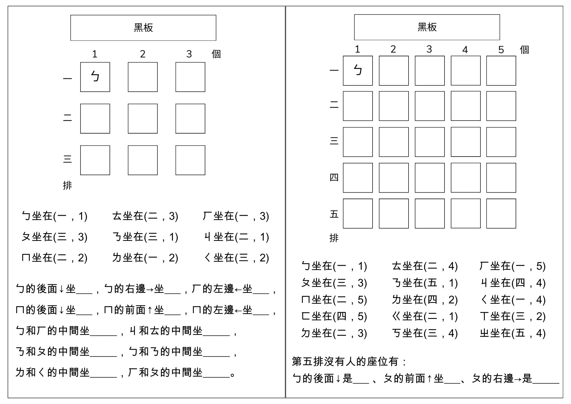 教案分享:座位邏輯推理 Post author:a00107 Post published:2025 年 12 月 23 日 Post category:教案 / 衛教資源 教案分享:座位邏輯推理 ♥小技巧♥活動開始前可以用有趣的方式開啟練習喔!例如:這些小朋友找不到座位,現在你當小老師,按照座標幫忙找座位喔!活動開始前可以先和小朋友說明一、二、三和1、2、3個代表的意思。此活動可以練習小朋友的空間位置(上下左右)還有注意力。可以先從左邊簡單的(3*3)先開始,再挑戰右邊的進階題(5*5)喔。 輔大醫院復健科 職能治療組 You Might Also Like 七大視知覺 2025 年 2 月 25 日 教案分享-形狀搜尋 2025 年 3 月 11 日 什麼是視知覺? 2025 年 9 月 2 日