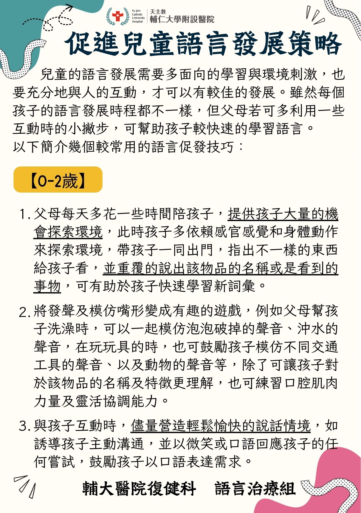 促進兒童語言發展策略【0-2歲】 Post author:a00107 Post published:2026 年 1 月 5 日 Post category:衛教資源 / 語言發展 You Might Also Like 認識發展協調障礙(四) 2026 年 3 月 4 日 居家活動建議-適用於大班~小學低年級活動量大和(或)注意力不集中之孩童 2025 年 10 月 1 日 淺談 兒童 注意力缺乏過動症 2025 年 2 月 24 日