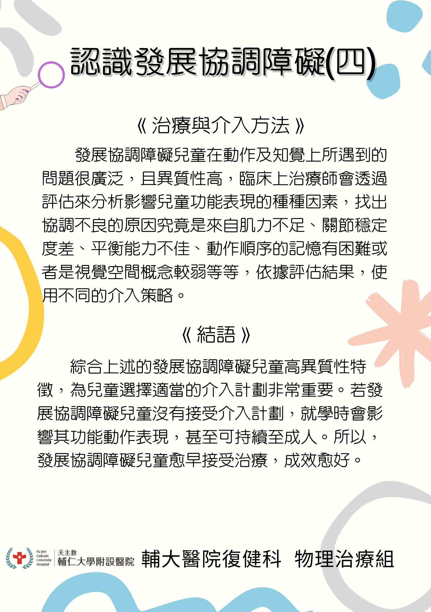 認識發展協調障礙(四) Post author:a00107 Post published:2026 年 3 月 4 日 Post category:發展遲緩 / 衛教資源 You Might Also Like 和我的孩子做朋友(情緒篇) 2026 年 2 月 2 日 注意力不足過動症 (ADHD) 《 行為篇 》 2025 年 2 月 24 日 注意力不足過動症(ADHD)治療篇 2025 年 10 月 1 日
