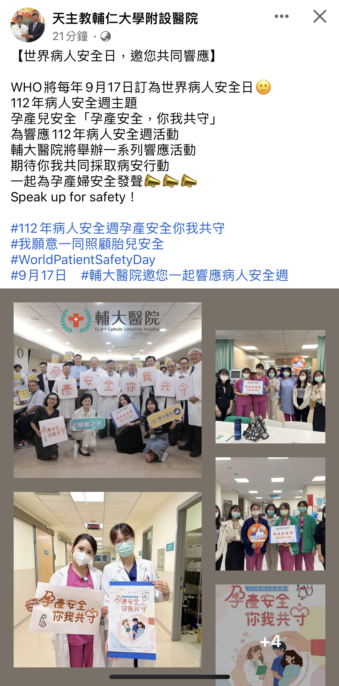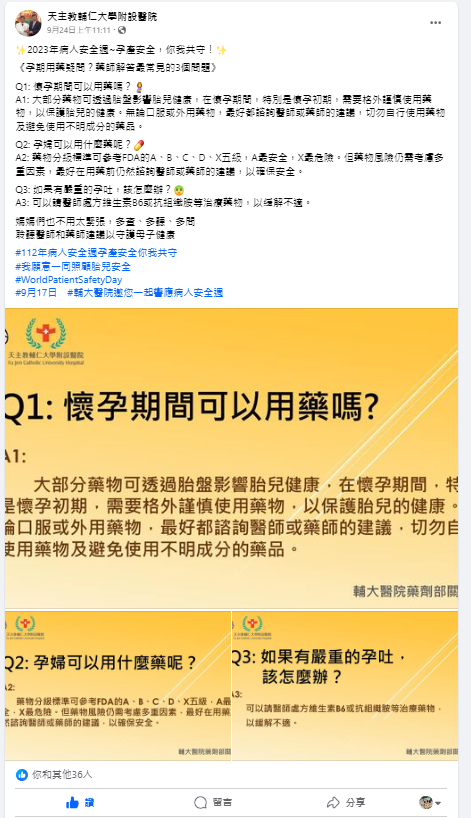 輔大醫院Facebook粉絲專頁宣導病人安全週 | 輔大醫院官方Facebook宣導病人安全週主題,並衛教民眾孕婦之正確用藥知識 |